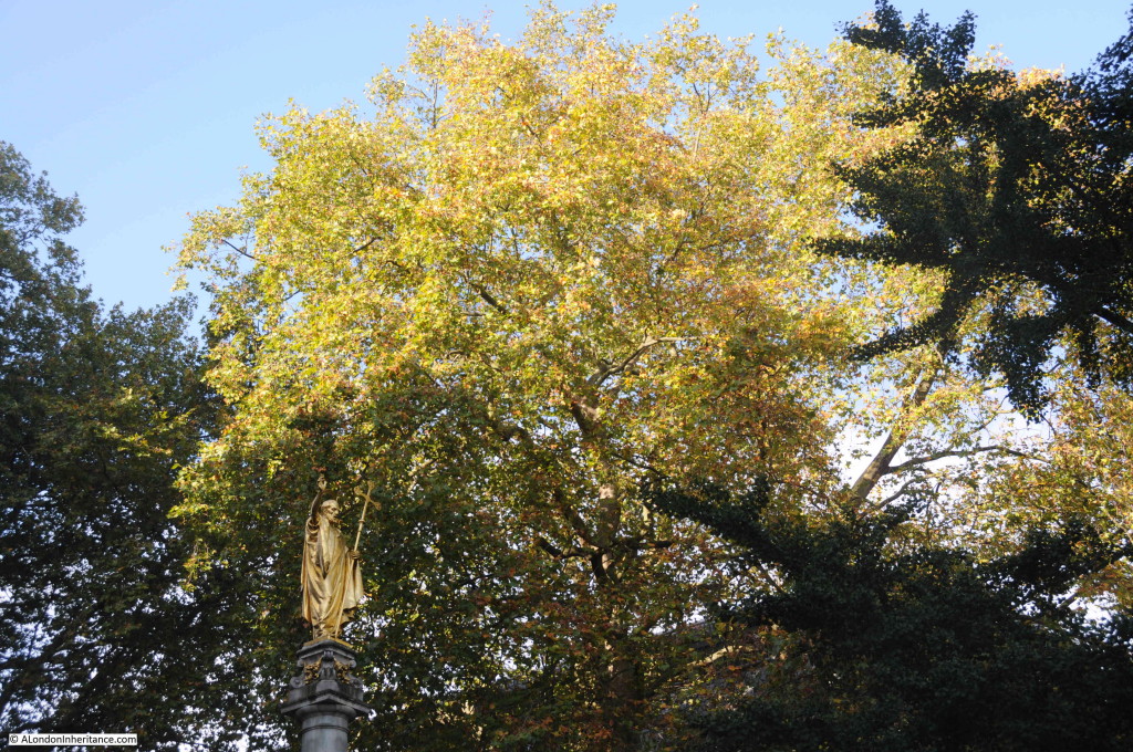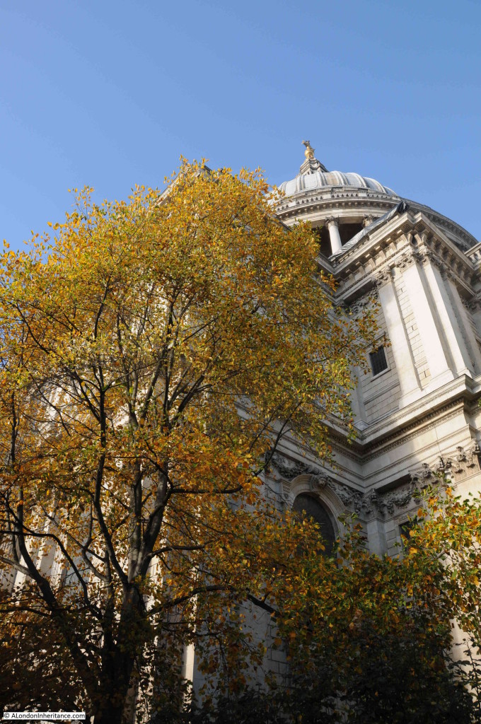 Here plenty of mature trees can be found around the eastern half of the cathedral and their autumn colours looking spectacular against both the stone of St. Paul’s and the sky: