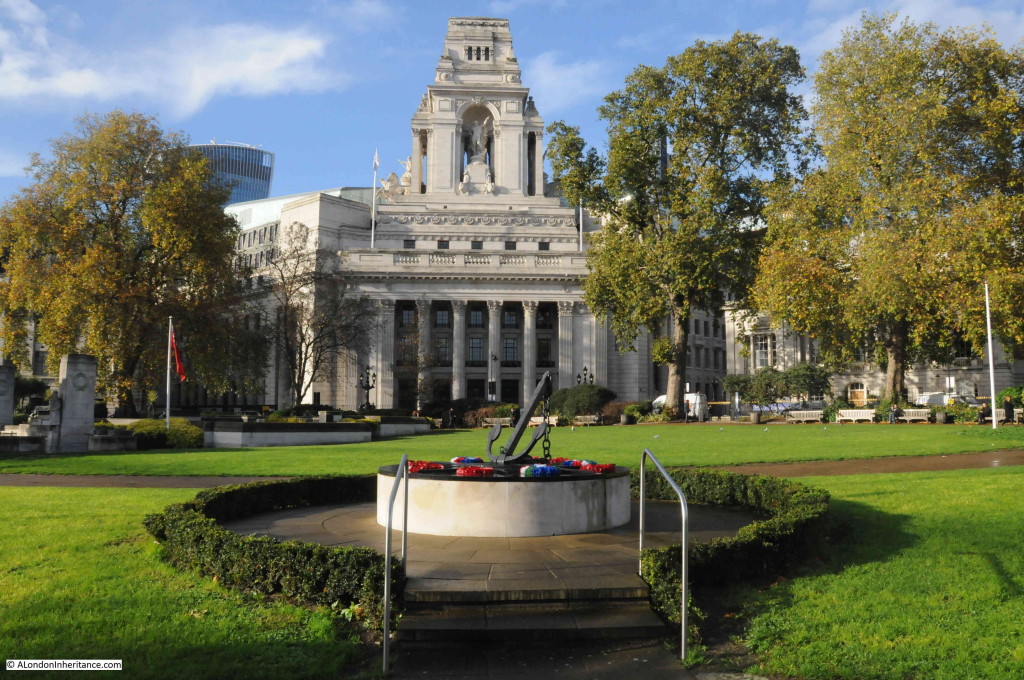The old Port of London Authority building in the background with the new memorial to Royal Fleet Auxiliary and Merchant Seamen who lost their lives in the Falklands Campaign. The mature trees around the edge of the gardens just starting to change to their autumn colours: