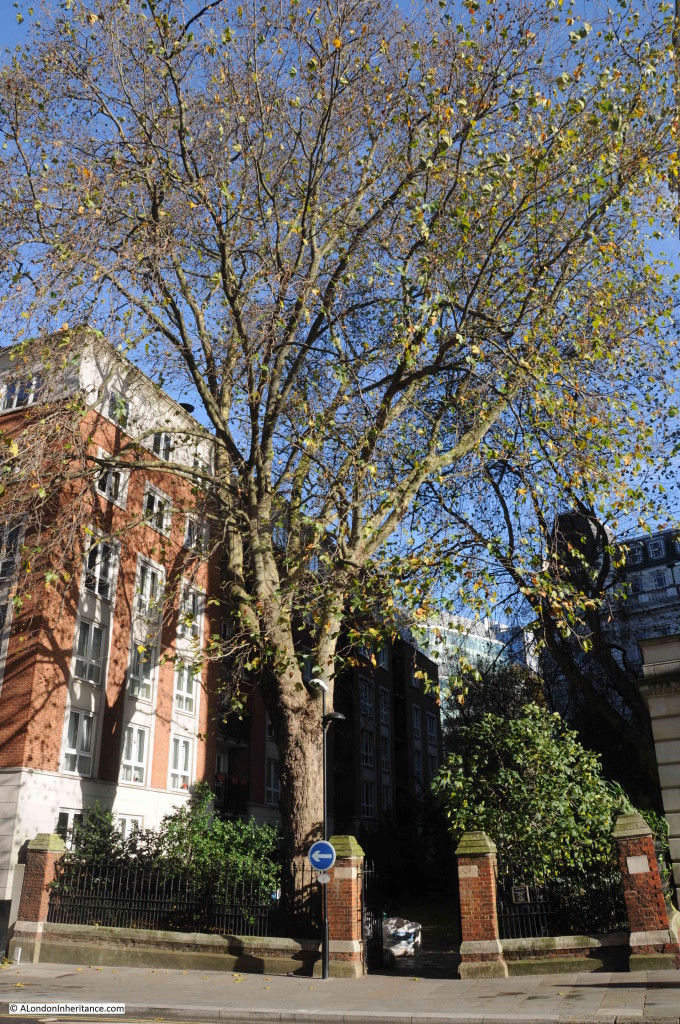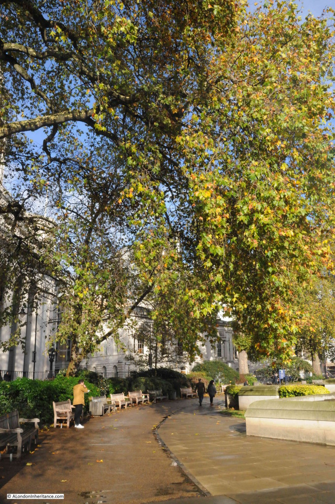 Walking to the end of Gresham Street, then turning up St. Martin’s Le Grand I came to Postman’s Park. At this time of year, the sun does not reach above the buildings to the south in order to shine on Postman’s Park, so the park spends much of this time of year in shade that appears to be made darker by the sunlight on the surrounding buildings. Many of the trees here had already lost the majority of their leaves: