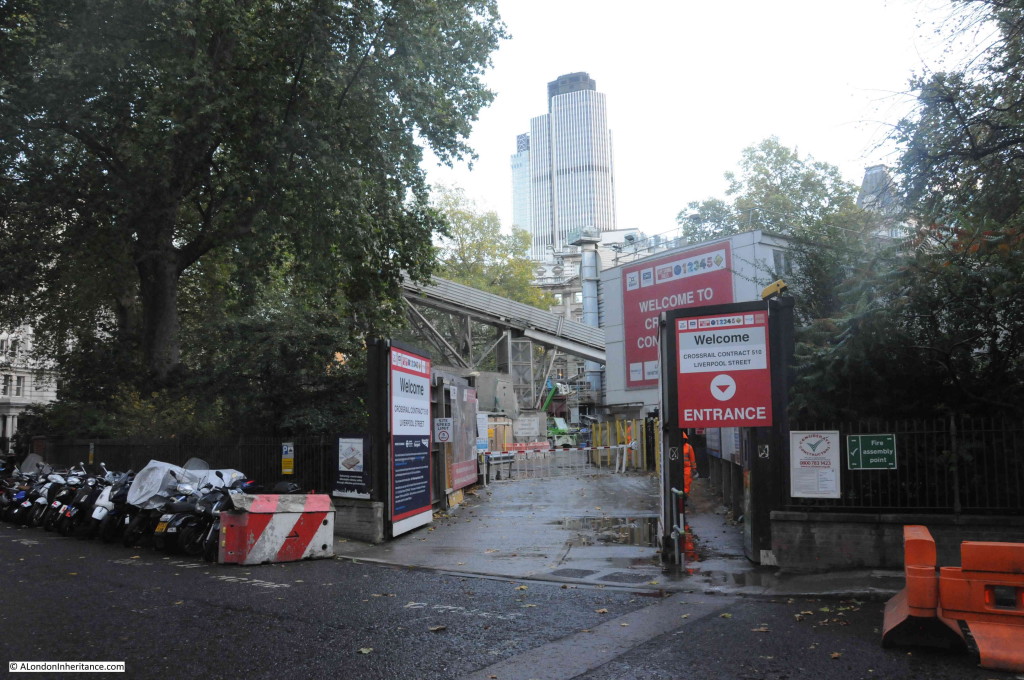The main entrance to the Crossrail construction site which currently occupies much of the gardens in the centre of Finsbury Circus: