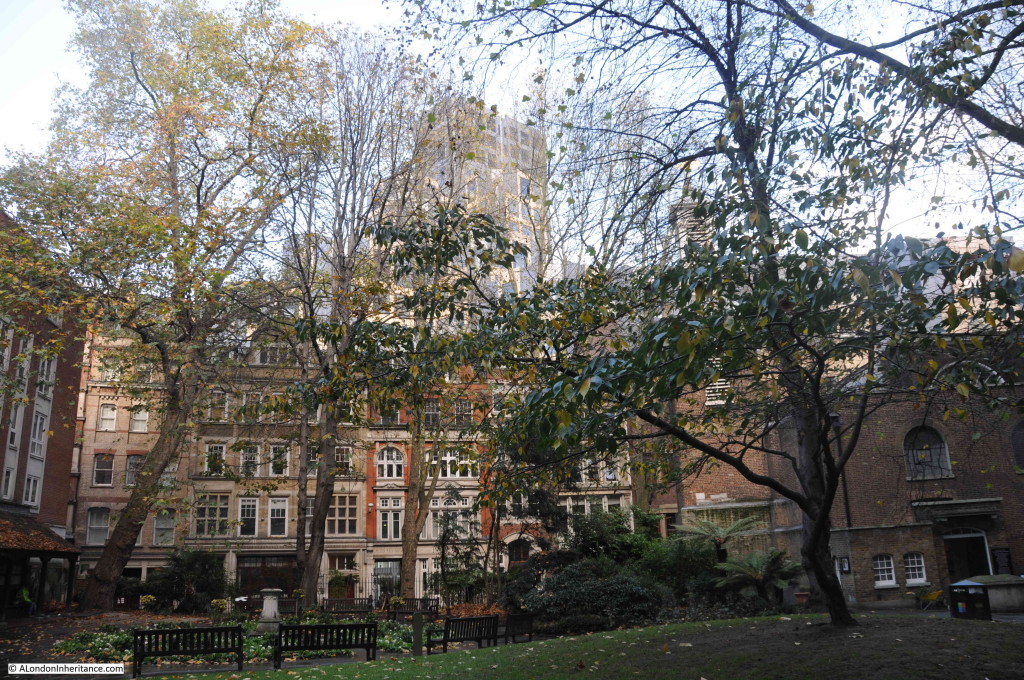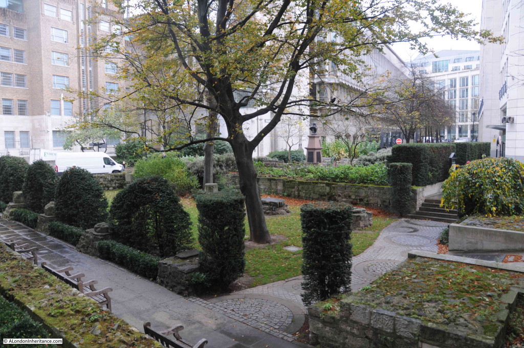 There are very few green spaces left in the City, the majority that remain are usually associated with a church, either still remaining or one that was lost in the last war, and it was to one of these that I headed to after Finsbury Circus.
