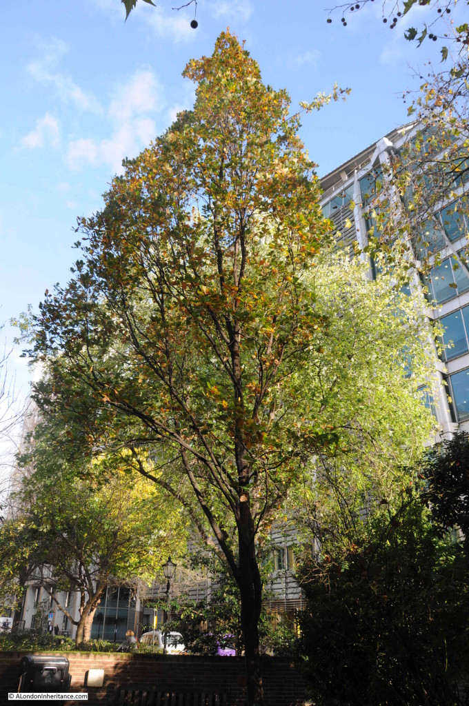 This garden occupies a relatively small space, however some mature trees reach up to the sky in amongst the surrounding buildings, with the leaves starting to turn to their autumn colours: