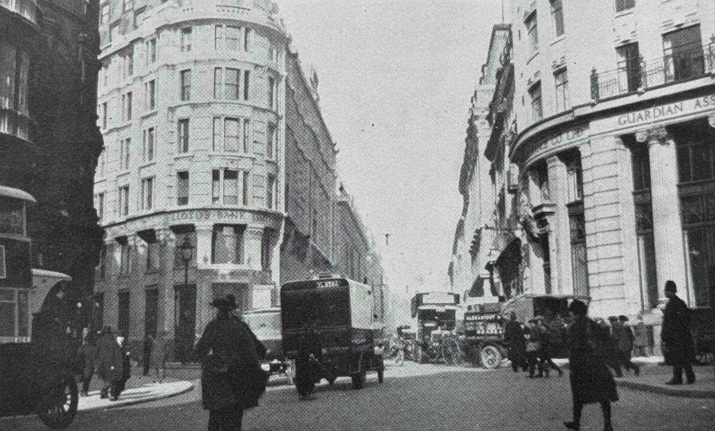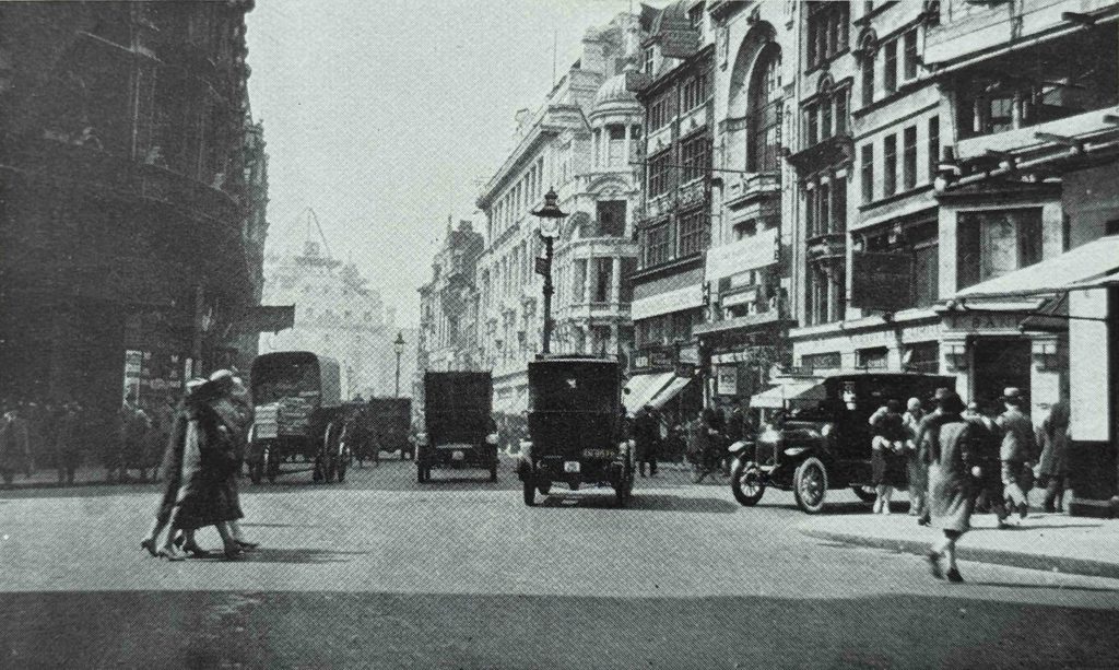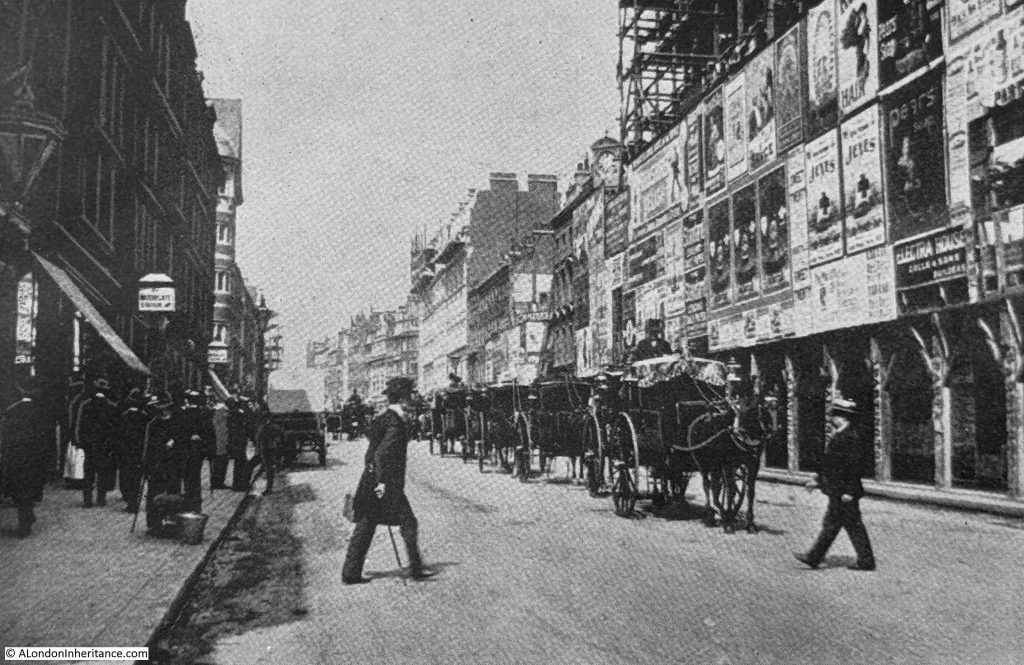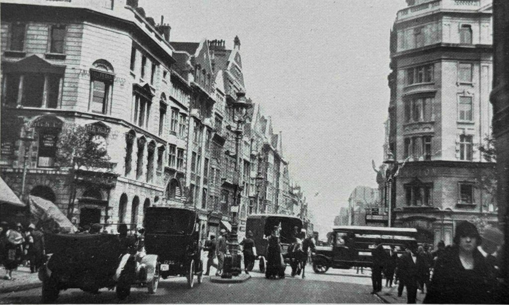 The photo was taken a short way down Haymarket, and the first street leading off to the left is St. James’s Market. It is from the 1920s as we can now see a large number of motor vehicles in the street.