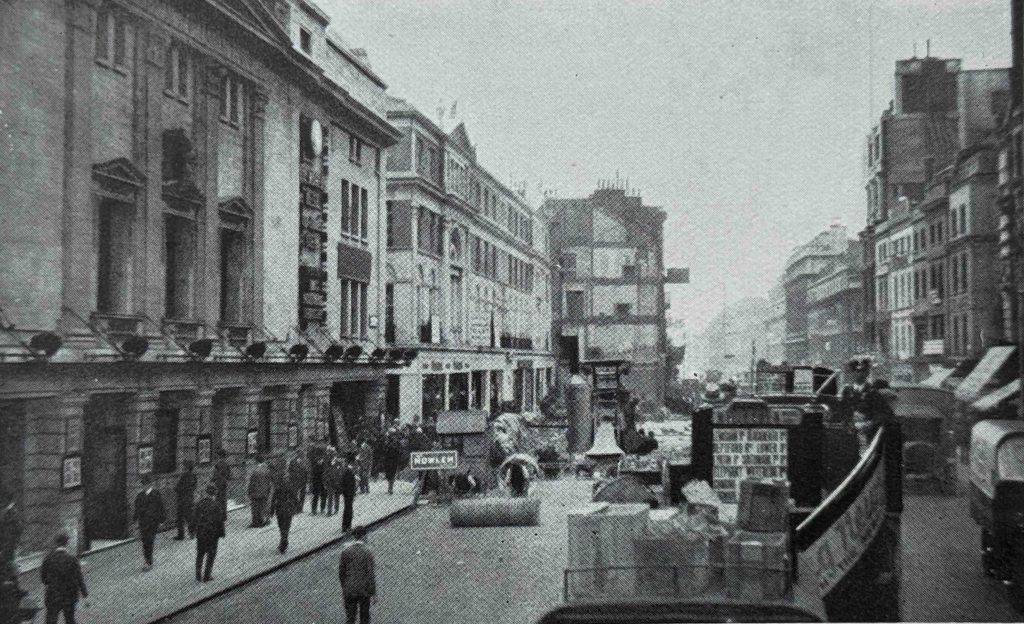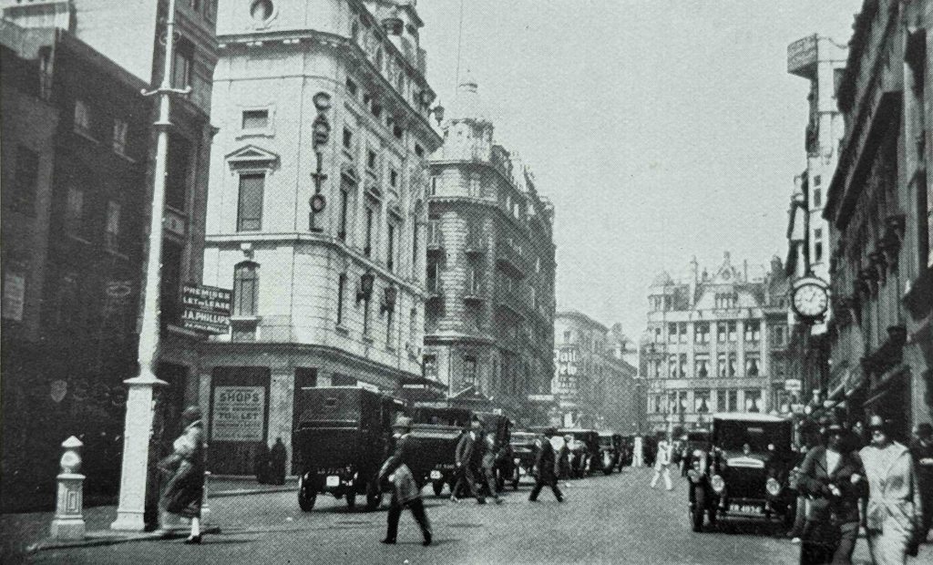 The building at the far end of the street, with the triangular shaped top to the façade is still there in Coventry Street, and the ground floor now houses a Five Guys, the following photo shows the same view today, with the old Capitol theatre building on the left, and the triangular shaped upper floor building at the end of the street: