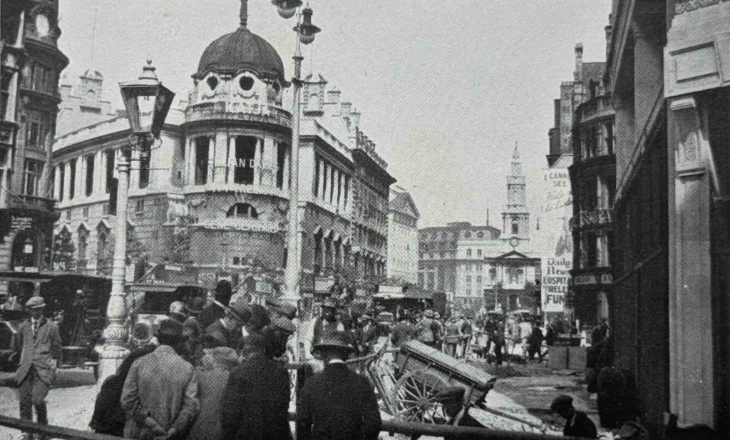 The rebuilt King William Street shows how buildings were increasing in height amd becoming more imposing. We can also see the start of the transformation of vehicles types with horse drawn in the above photo and just over 30 years later, a motor driven lorry van be seen in the foreground: