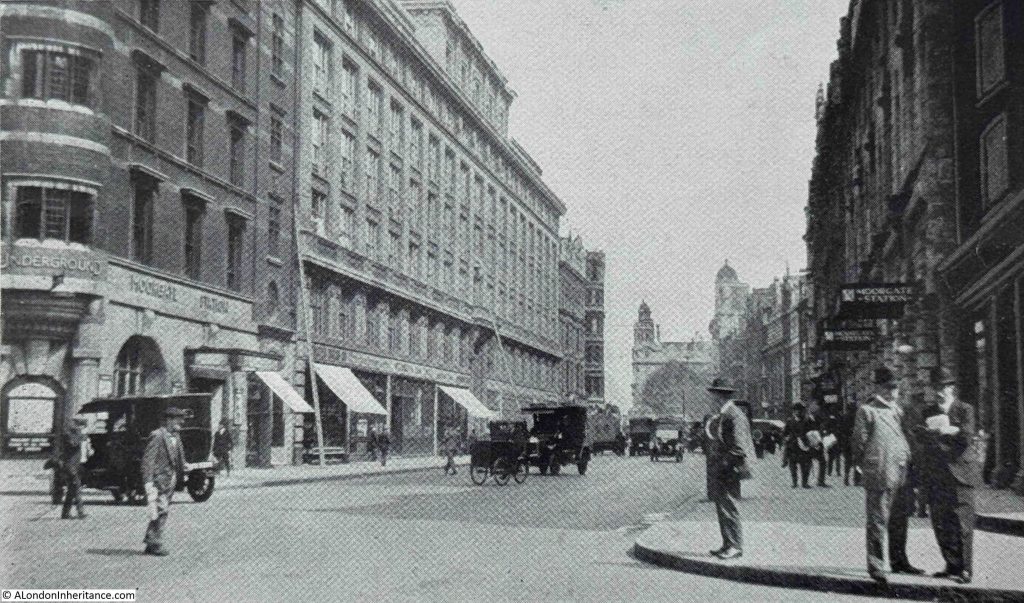 Today, Finsbury Pavement is known as Moorgate. The following photo is from the mid 1920s and shows the street rebuilt, and new entrances to Moorgate Station can be seen to the left and right: