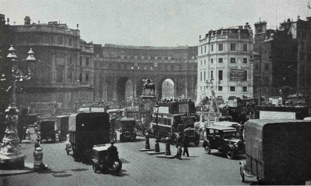 There do appear to be a number of errors in the labelling of some of the photos in the book, so I am not sure how much either Harold Clunn, or his editor checked. In the above two photos, the first is labelled “Charing Cross in 1904, prior to the construction of the Admiralty Archway”, and the reference to Admiralty Archway implies that the archway would be built somewhere in the scene in the old photo, however the “prior” photo is looking down Whitehall (the buildings on the left are still there), the photo is not looking down the Mall, which is the location of the Admiralty Archway.