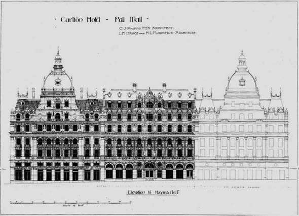To the left of the new version of the theatre (which can be seen to the right of the glass fronted building), the Carlton Hotel was built. The following drawing shows the elevation of the hotel facing onto Haymarket, with the rebuilt His Majesty’s Theatre in outline on the right (which can still be seen in the above photo):