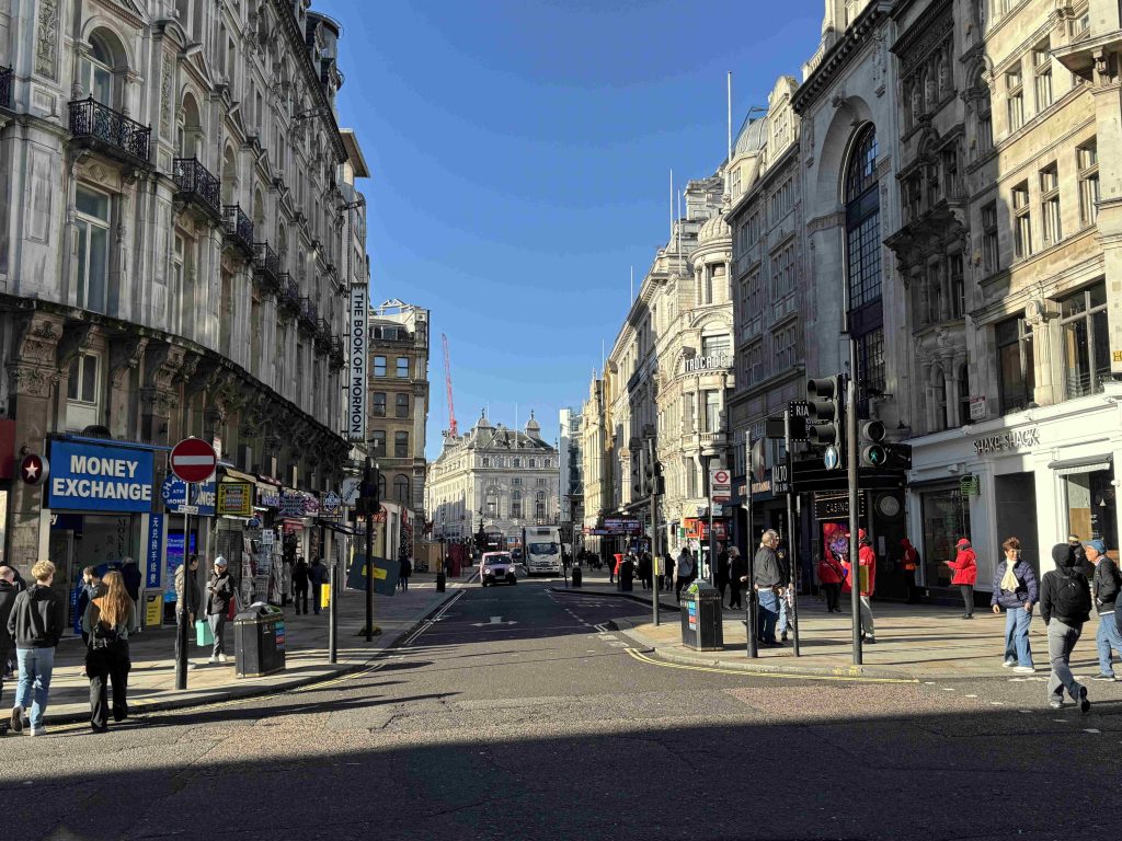 In the above photo there is a sign for “Wales” on the left, and this is the Prince of Wales Theatre, so the street on the right is Rupert Street and Piccadilly Circus is in the distance.