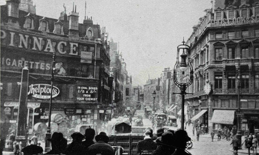 In the 1904 photo of Coventry Street, on the right you can see some of the late 18th century houses surviving from the first stages of development of the area. These had been demolished by the 1920s, and replaced with the larger buildings, many of which survive today, including the building on the right with the dome on the corner just below the roofline, which is the Trocadero.