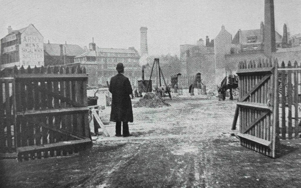 As well as the replacement of individual buildings, the late 19th and early 20th century saw large areas of London completely rebuilt. One of these was around Kingsway and Aldwych, and the following photo shows a large open space where the construction of Kingsway was underway in 1904: