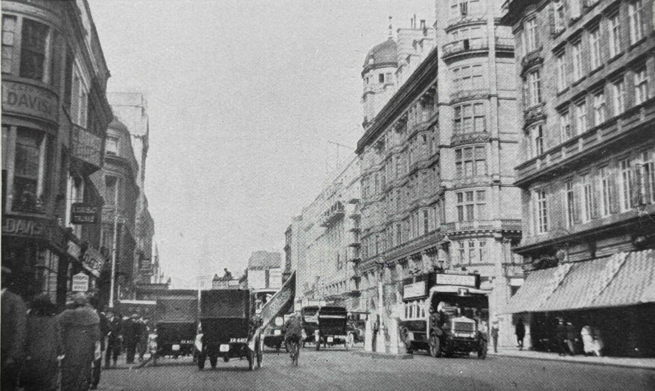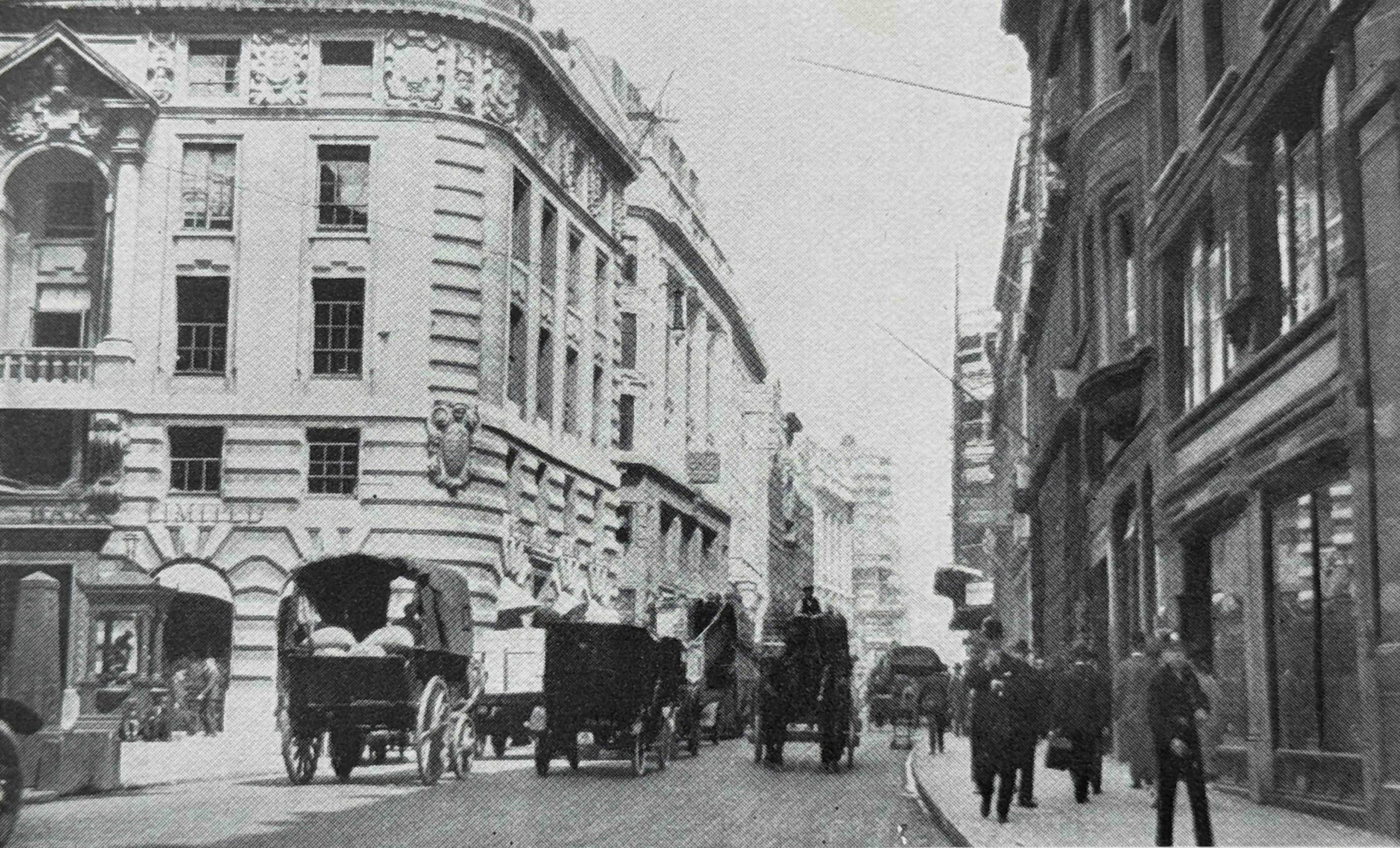 The rebuilt King William Street shows how buildings were increasing in height amd becoming more imposing. We can also see the start of the transformation of vehicles types with horse drawn in the above photo and just over 30 years later, a motor driven lorry van be seen in the foreground: