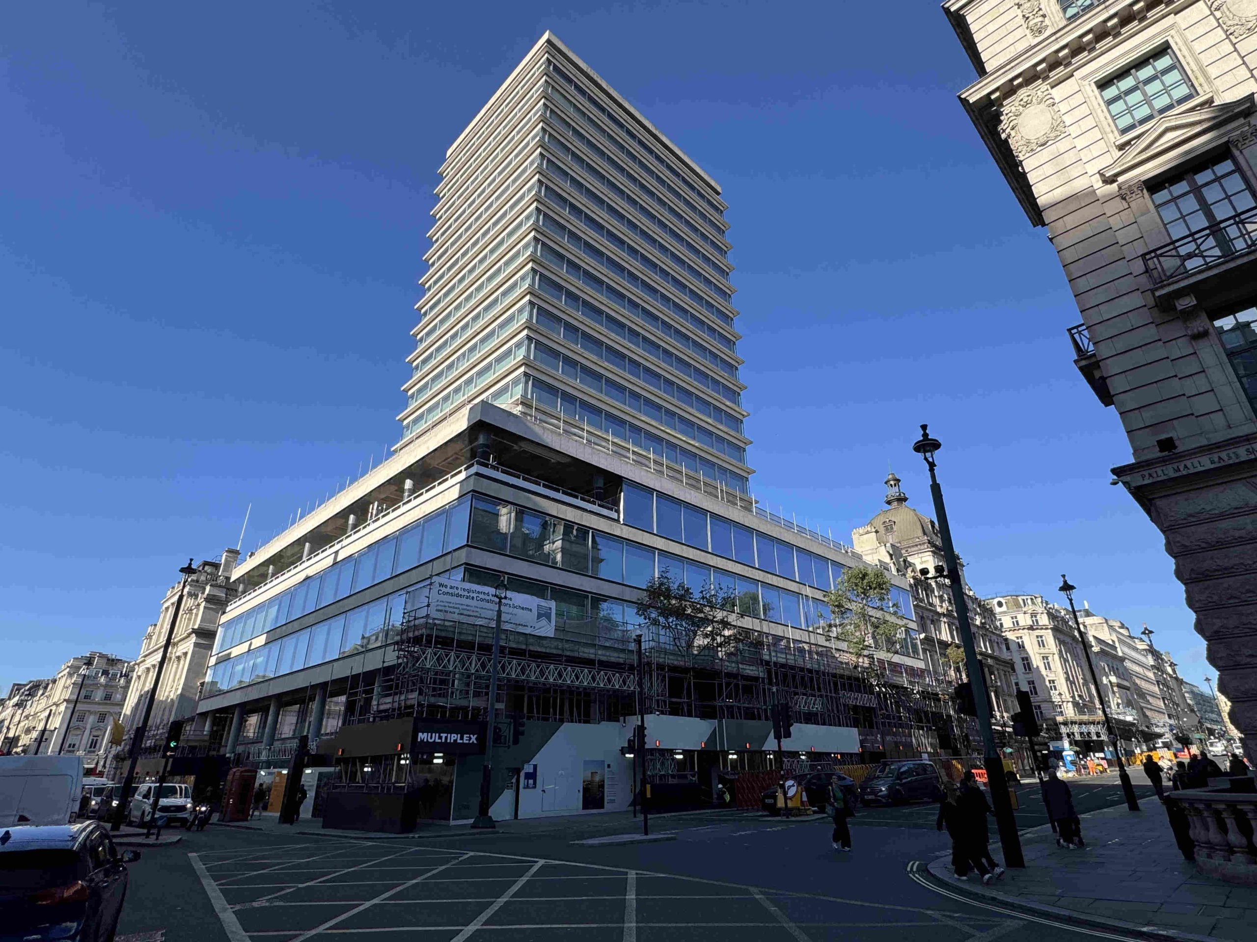 The above photo was taken in Cockspur Street, just after leaving Trafalgar Square. The building on the left is still there, as is the second building on the right. The Carlton Hotel is the building in the middle, furthest from the photographer, and the large dome on the roof is the same as that shown in the plan for the hotel.