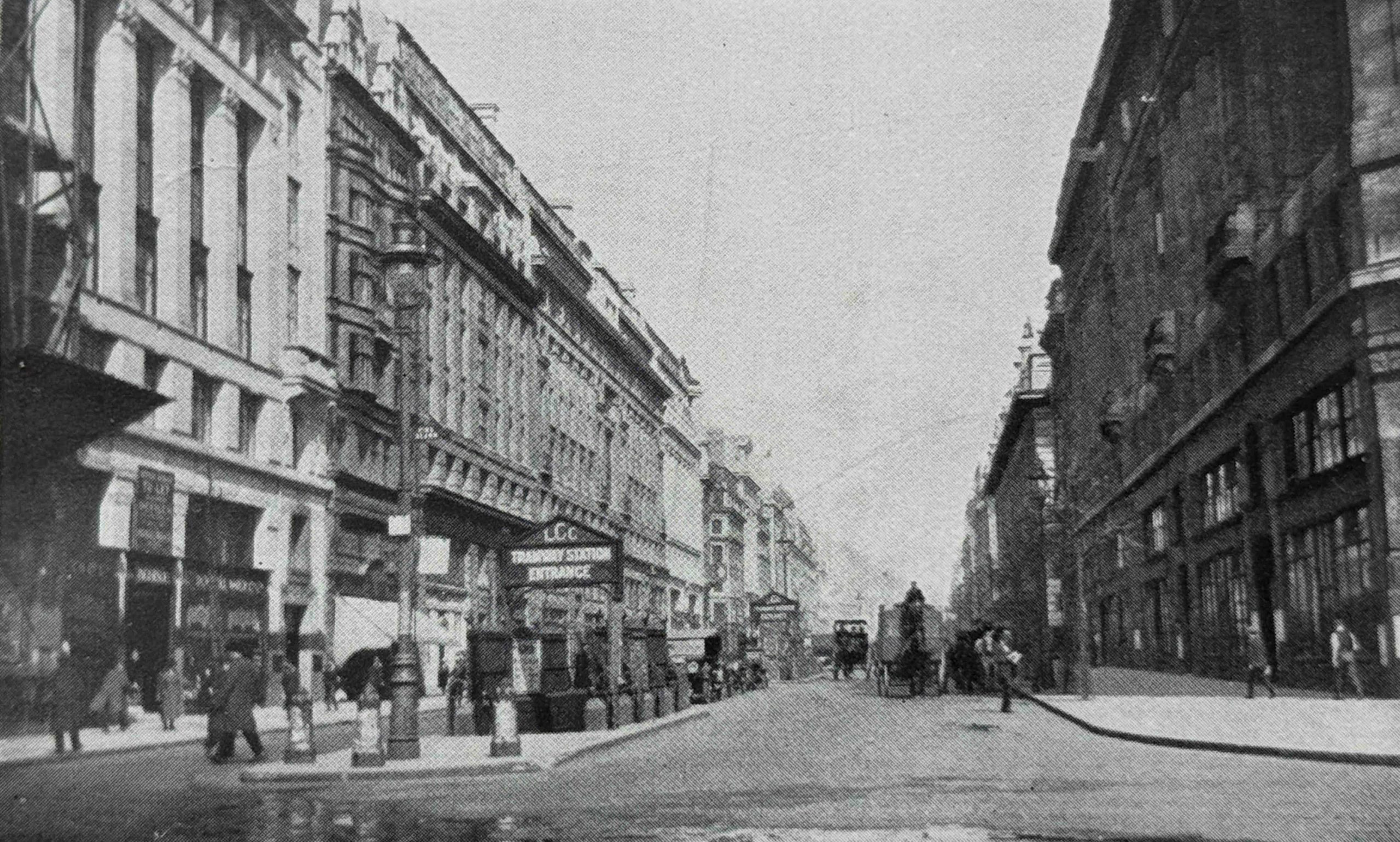 The photo was taken a short way down Haymarket, and the first street leading off to the left is St. James’s Market. It is from the 1920s as we can now see a large number of motor vehicles in the street.