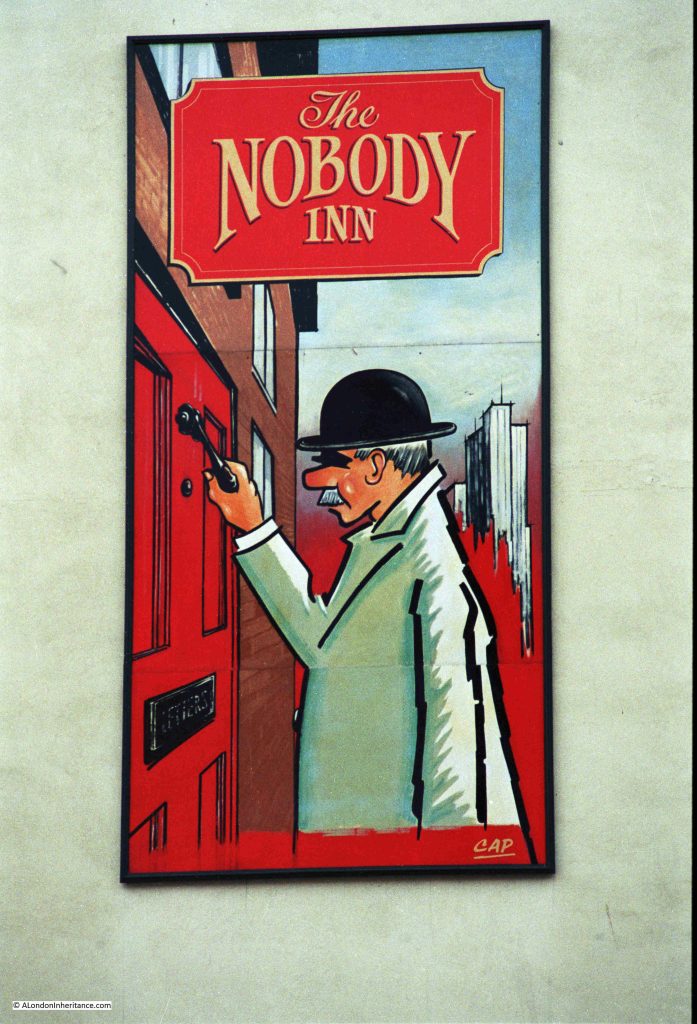 The pub as it is today, but now called the Lady Mildmay. The large panel on the side of the pub which had the image of the man knocking on a door, with the Nobody Inn name is still on the side of the pub – it would be interesting to know if the 1980s image is still there, and it was just painted over: