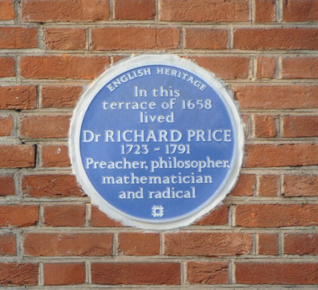 Richard Price died in 1791. He wife Sarah had died five years earlier in 1786. They are both buried in Bunhill Fields. The sermon at the funeral was given by another prominent dissenter and natural philosopher (an 18th century version of a scientist), Joseph Priestly.