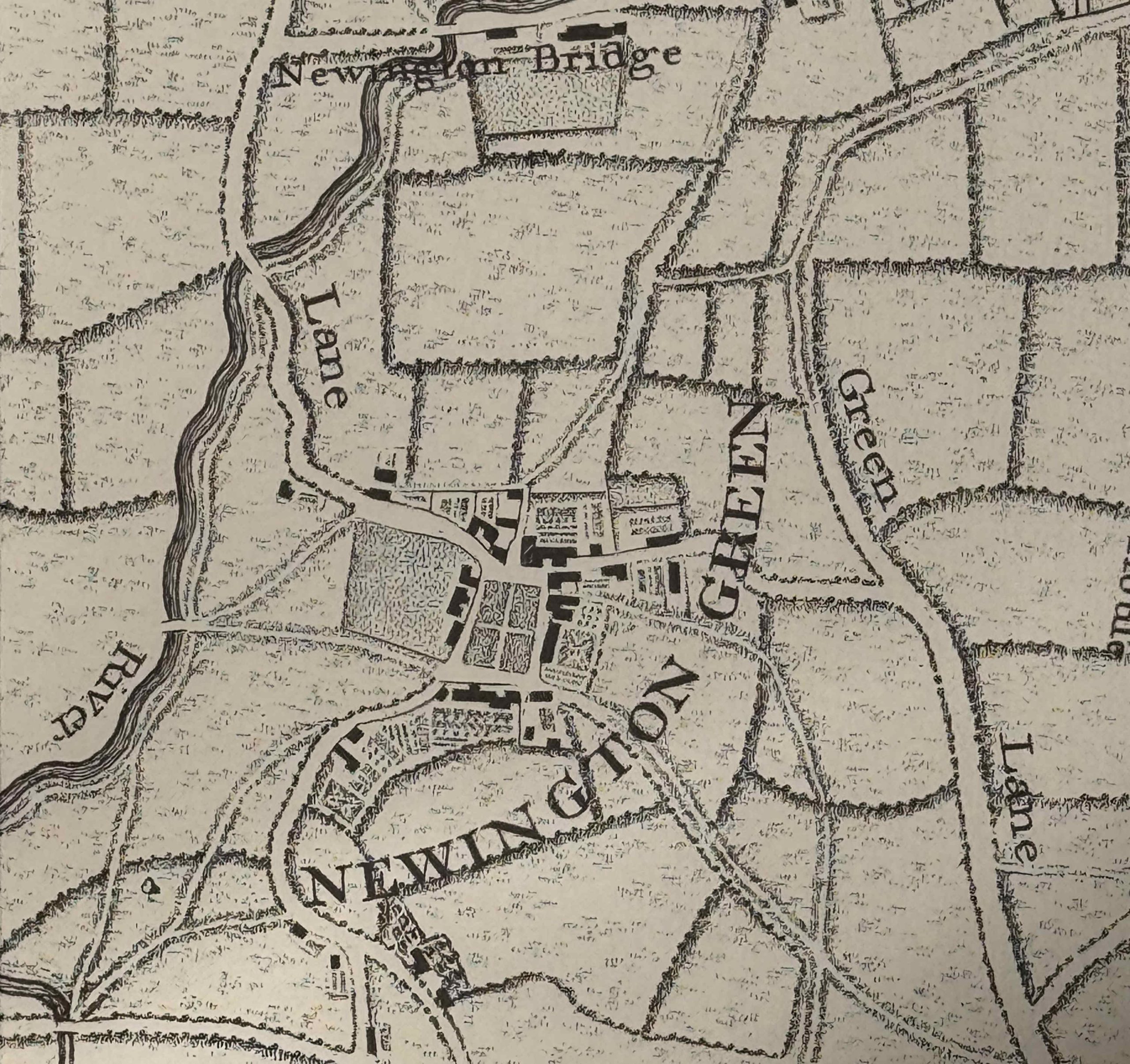Houses and small holdings / gardens also surrounded the green on all four sides, and the forests that once surrounded Newington Green had been cleared with fields covering the wider area. The New River was also to be found just to the west, as shown in this extract from Rocque’s 1746 map of London: