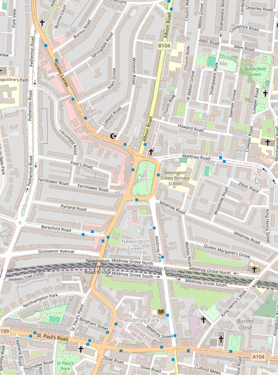 In the following map of the area today, Newington Green is the green space at the centre, surrounded by the dense housing that covered the fields during the 19th century (© OpenStreetMap contributors):