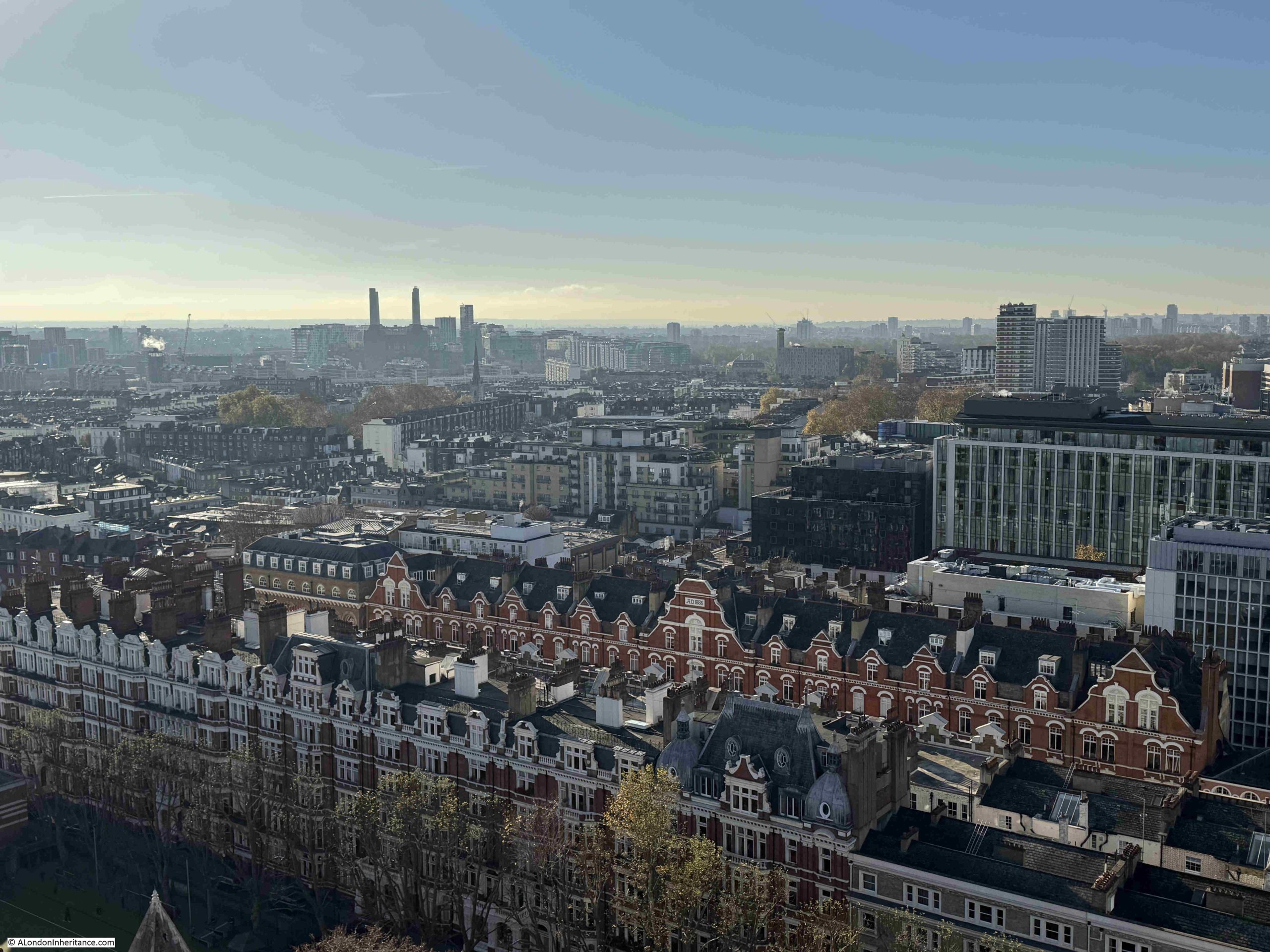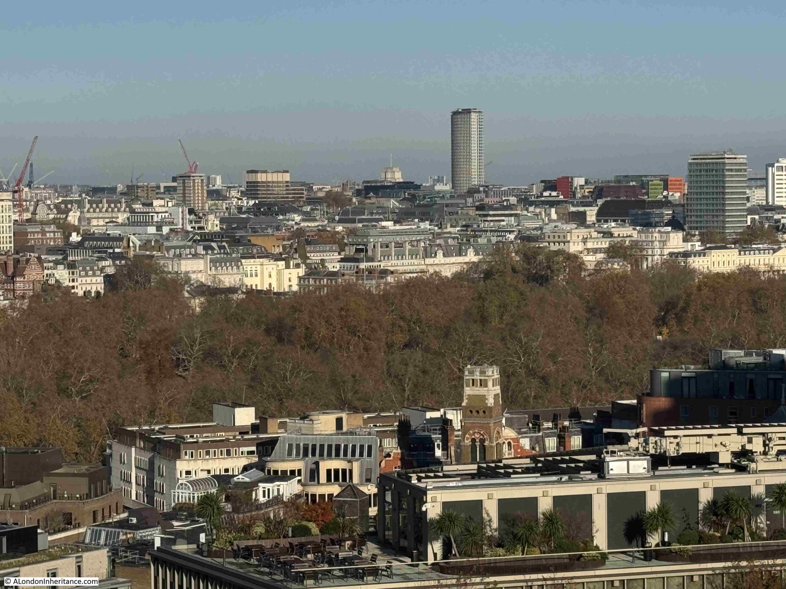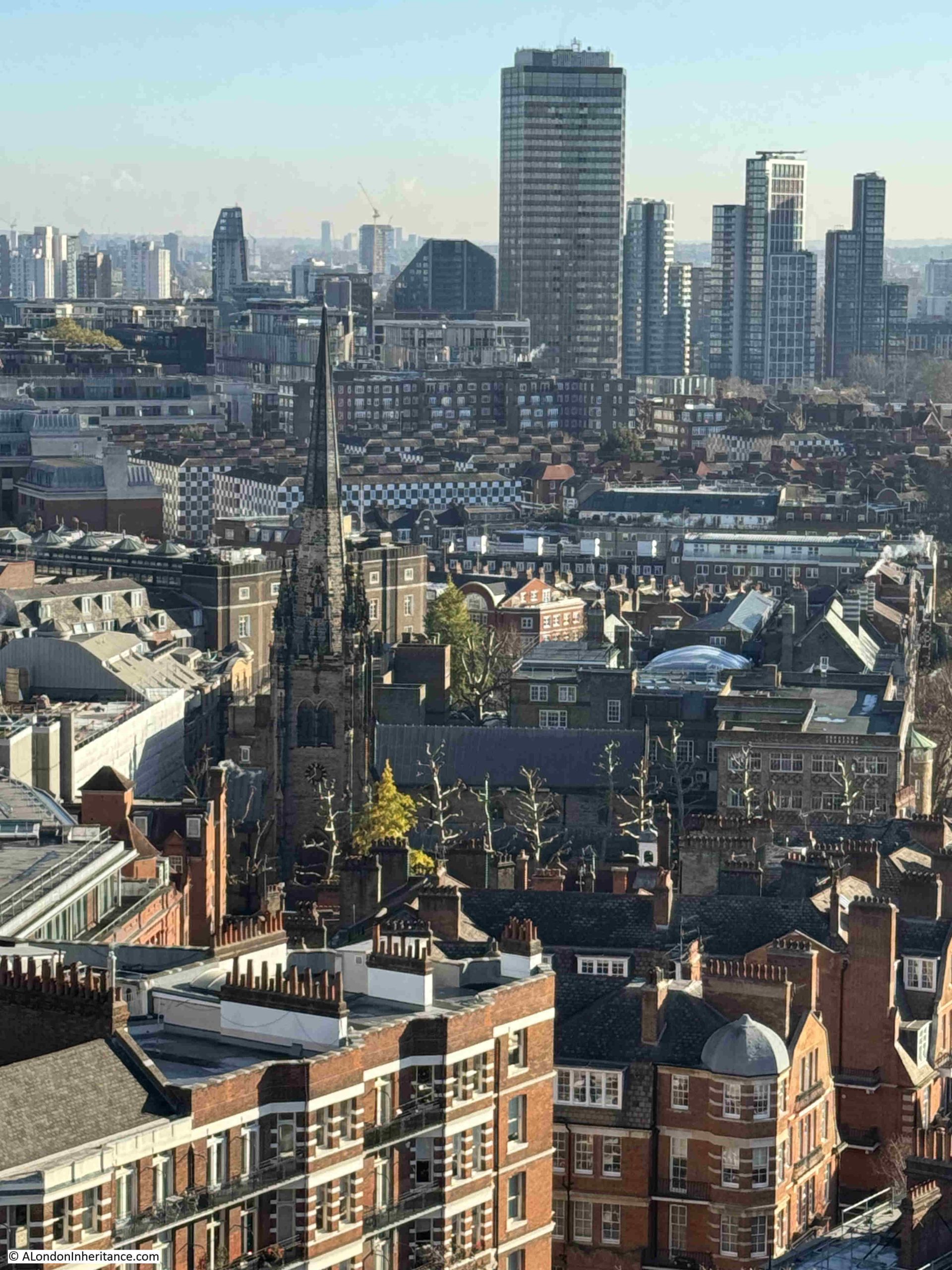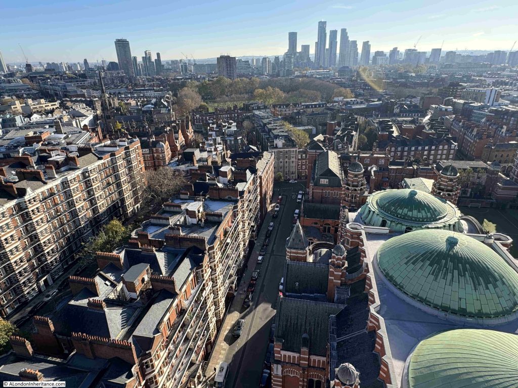 In the lower right of the following photo are two of the domes on the roof of Westminster Cathedral, and the towers in the distance are part of the recent developments at Nine Elms on the southern side of the Thames: