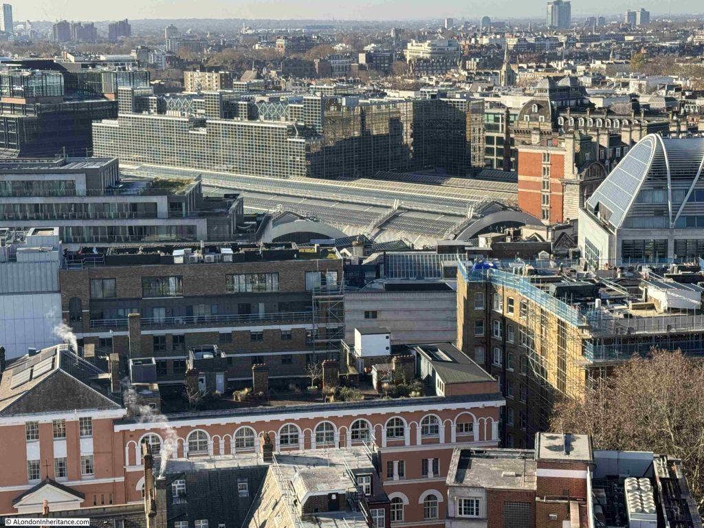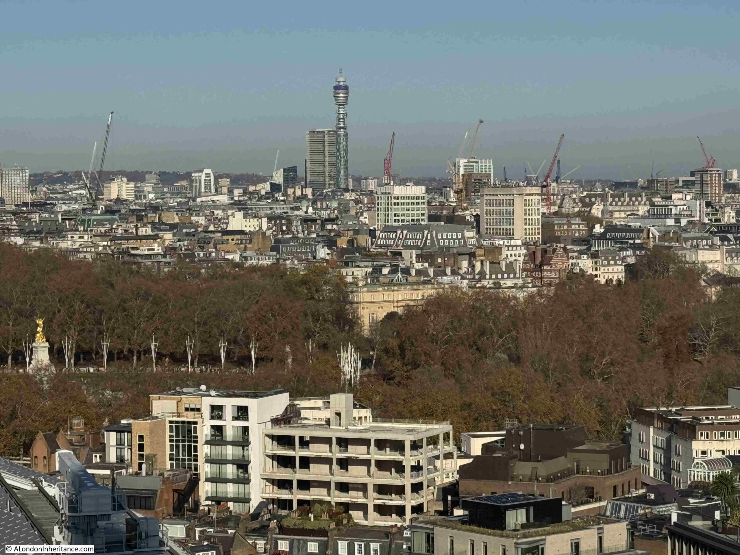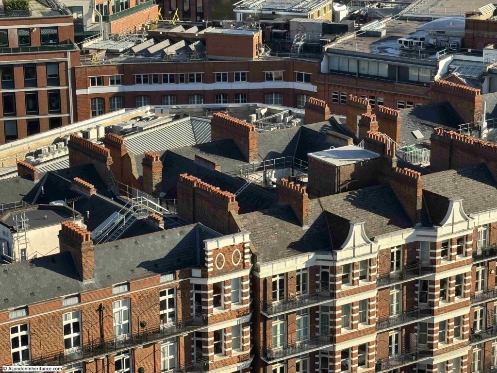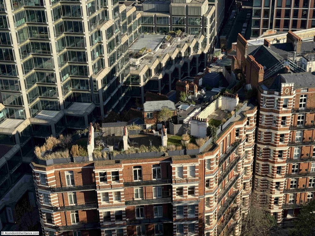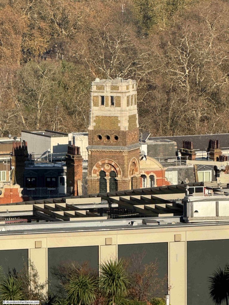 In the lower right of the following photo are two of the domes on the roof of Westminster Cathedral, and the towers in the distance are part of the recent developments at Nine Elms on the southern side of the Thames: