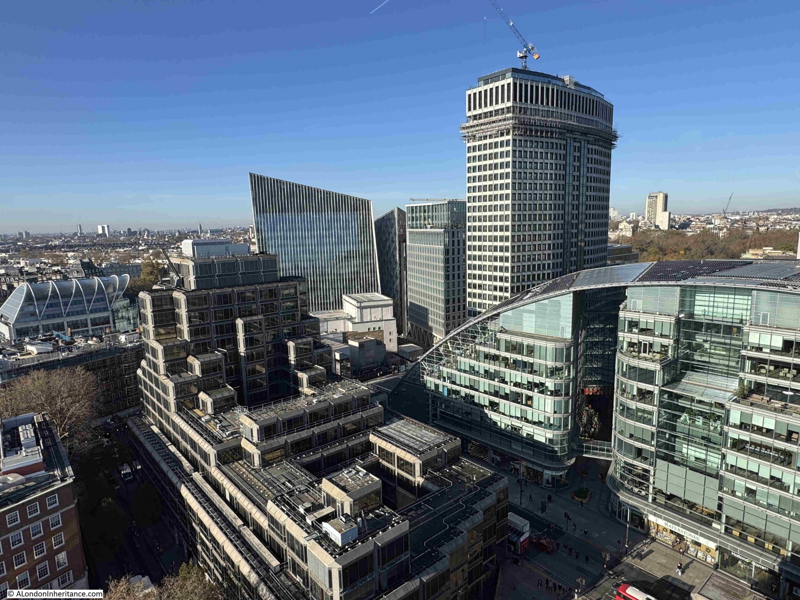 In the centre of the following photo is the Post Office / BT / New Hotel Tower, with Euston Tower in the background. Again, this view shows that there have been very few buildings of much height constructed since the Post Office Tower (officially opened 1965) and Euston Tower (completed in 1970) in this part of the city:
