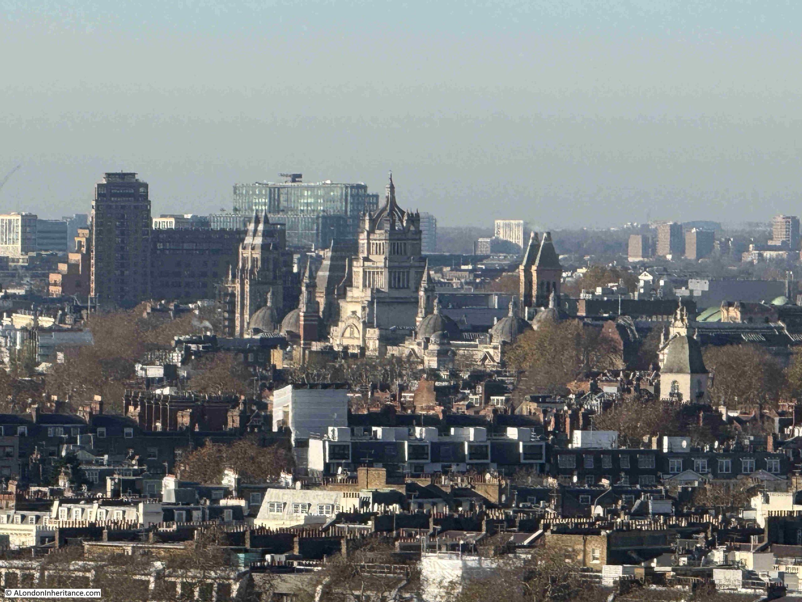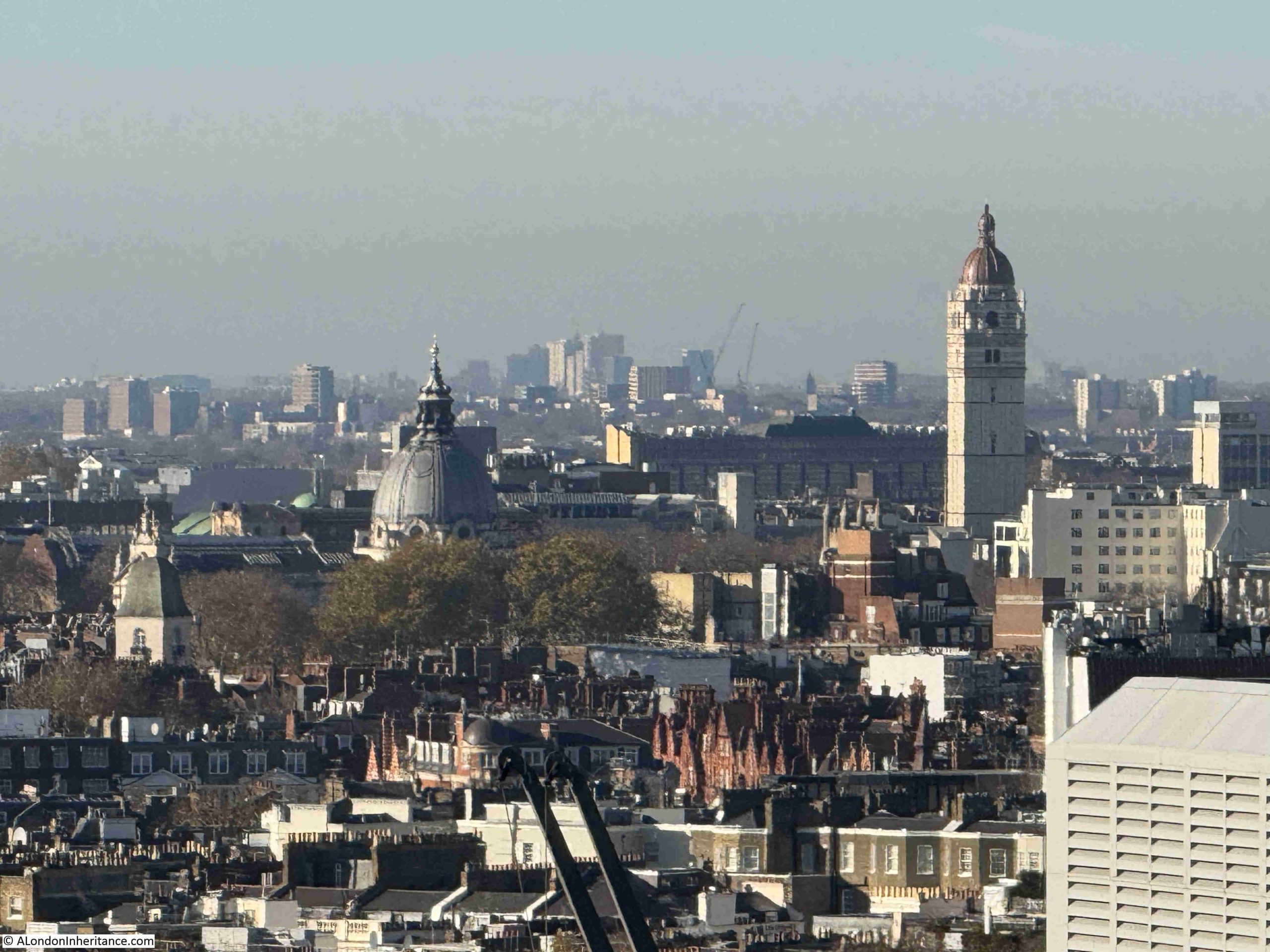 The dome in the following photo is that of the Brompton Oratory, and the tower to the right is the Queen’s Tower at Imperial College London, also in South Kensington. It is hard to tell from this distance, but I think the Queen’s Tower is still wrapped in sheeting as restoration work has been underway: